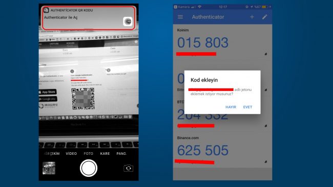 Hesap güvenliğiniz için Google Authenticator (2FA)’yı etkinleştirmenizi tavsiye ediyoruz. Cep telefonunuzun kamerasını açın ve sayfadaki karekodu okutun. Ardından Authenticator ile aç seçeneğine tıklayın. Buraya tıkladıktan sonra Kod ekleyin alanı çıkacak. EVET‘e basın. Bu kod 15-20 saniyede bir değişmektedir. KuCoin’e güvenli giriş yapmak için Google 2FA’yı kullanın.
